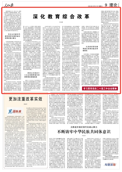 教育是國之大計、黨之大計,教育興則國家興,教育強(qiáng)則國家強(qiáng)。黨的二十屆三中全會通過的《中共中央關(guān)于進(jìn)一步全面深化改革、推進(jìn)中國式現(xiàn)代化的決定》(以下簡稱《決定》)提出:“教育、科技、人才是中國式現(xiàn)代化的基礎(chǔ)性、戰(zhàn)略性支撐”,并從深入實施科教興國戰(zhàn)略、人才強(qiáng)國戰(zhàn)略、創(chuàng)新驅(qū)動發(fā)展戰(zhàn)略,統(tǒng)籌推進(jìn)教育科技人才體制機(jī)制一體改革,健全新型舉國體制,提升國家創(chuàng)新體系整體效能出發(fā),對深化教育綜合改革作出系統(tǒng)部署。我們要深入學(xué)習(xí)貫徹全會精神,通過深化教育綜合改革,不斷為加快建設(shè)教育強(qiáng)國提供動力,有效支撐引領(lǐng)中國式現(xiàn)代化。